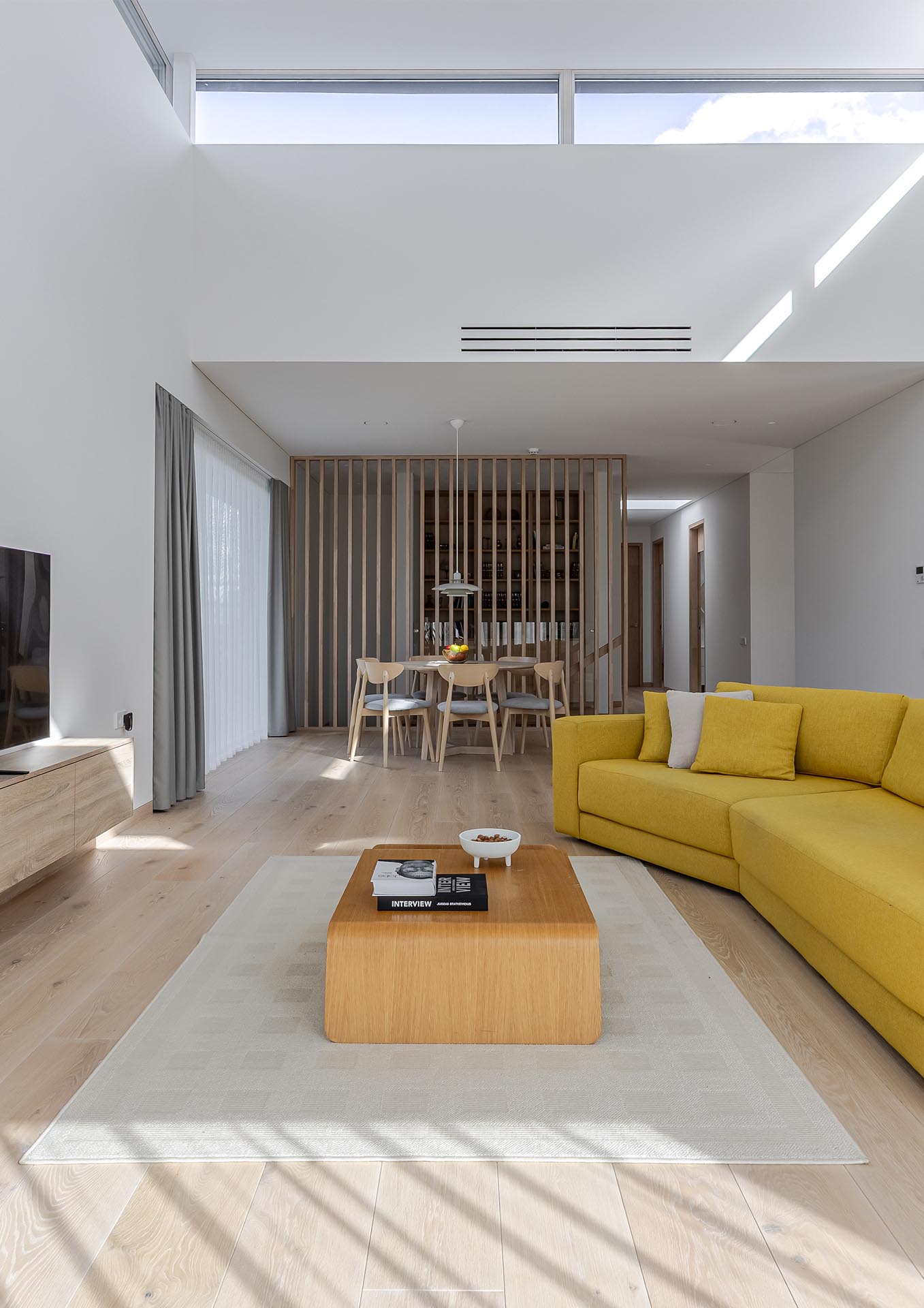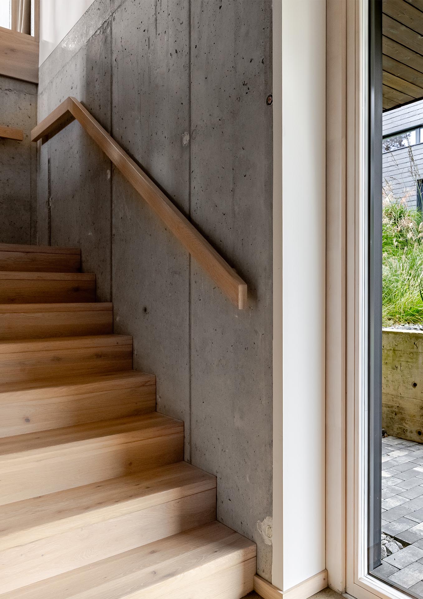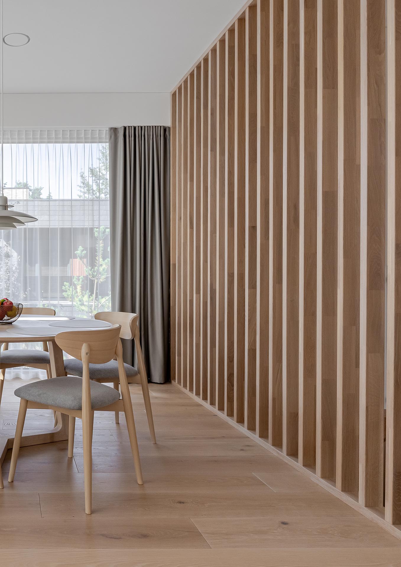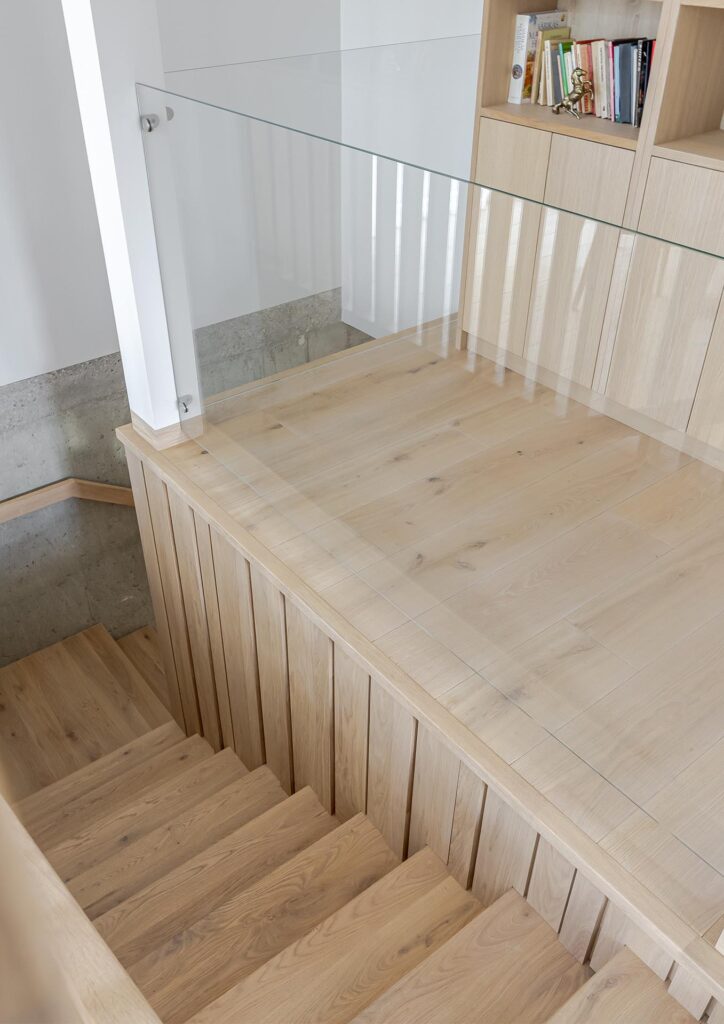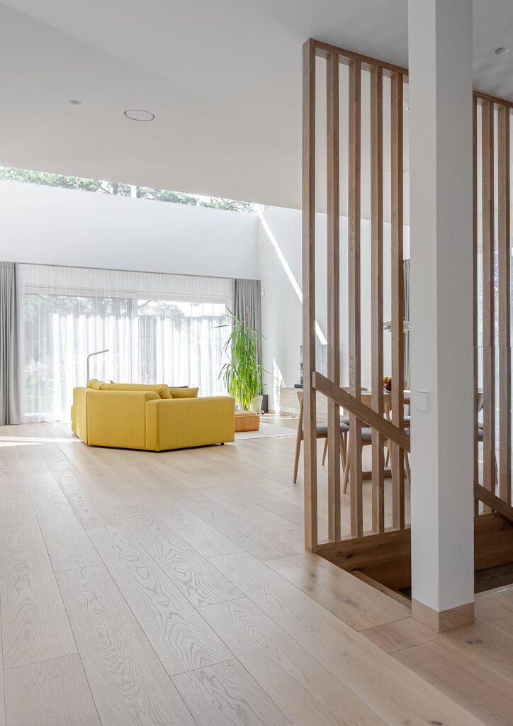 Podłog przestrzeni rytm i dynamikę, a schody oraz listwy w tym samym wybarwieniu zapewniają elegancką spójność. Dębowa przegroda dekoracyjna subtelnie rozdziela strefy, zachowując jednocześnie otwartość wnętrza.