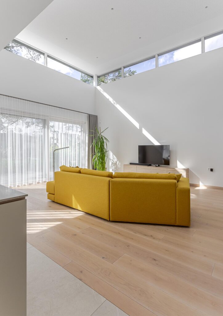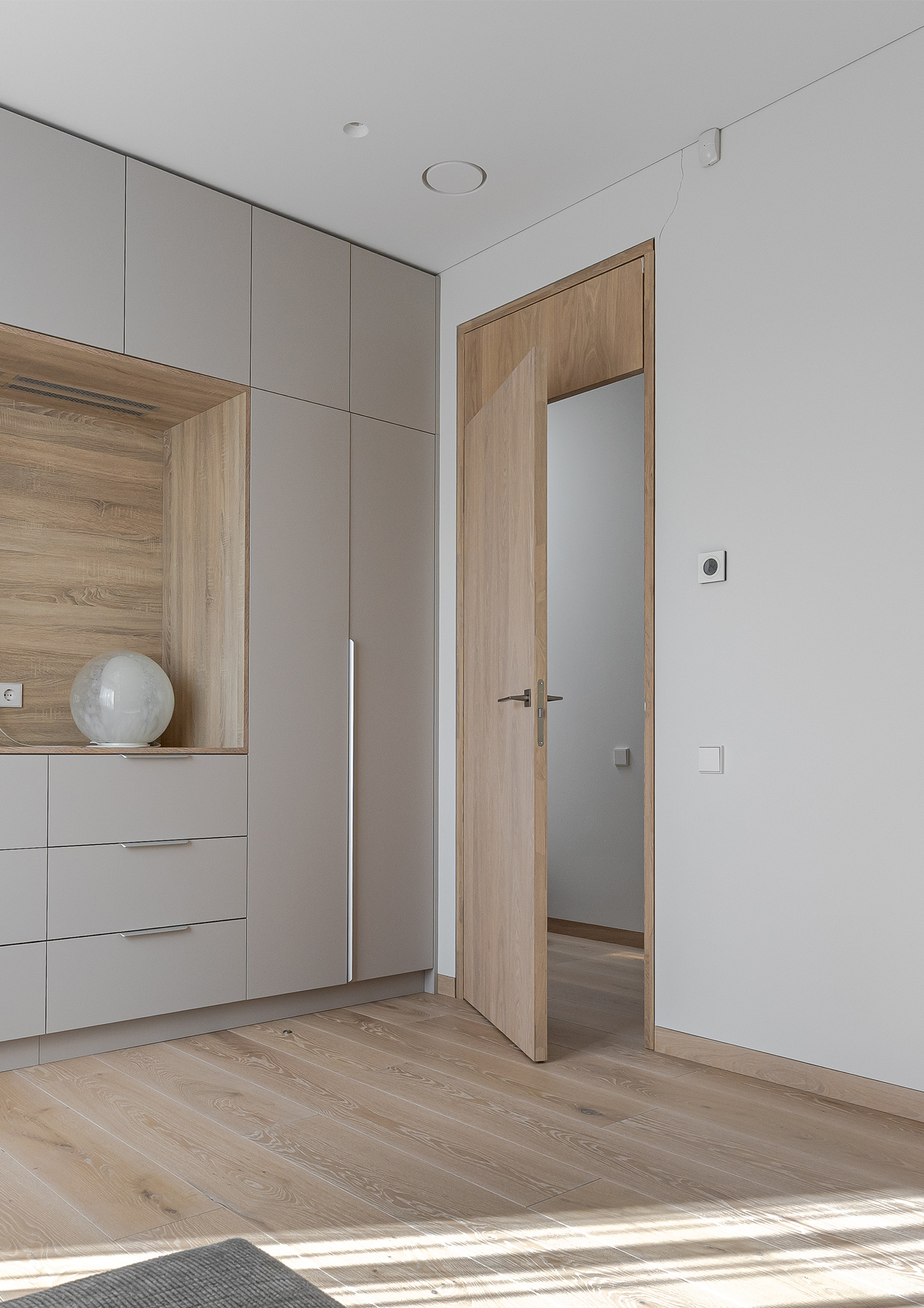 W tym projekcie wnętrza zastosowano wszystkie nasze produkty z drewna dębowego: podłogi, schody, drzwi, dekoracyjną przegrodę oraz listwy przypodłogowe. Dzięki temu udało się stworzyć spójną kompozycję, w której każdy element płynnie dopełnia kolejny, budując naturalne przejście między przestrzeniami.