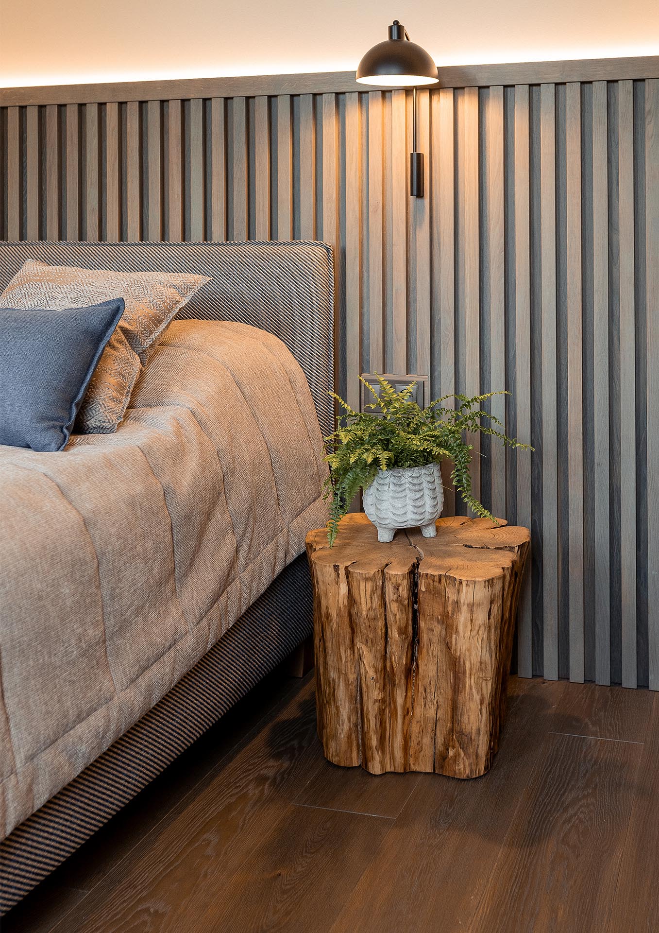 W tym projekcie klimat wnętrza tworzą dębowe podłogi w subtelnym odcieniu ułożone w klasyczny sposób. Kolor Silver Dust (Q-4505) dodaje przestrzeni lekkości i nowoczesnego charakteru, a przy tym podkreśla naturalne ciepło drewna. To wykończenie świetnie współgra zarówno z jasnymi ścianami, jak i z bardziej wyrazistymi materiałami.