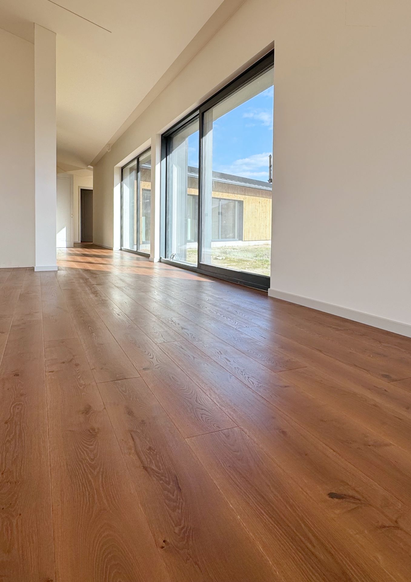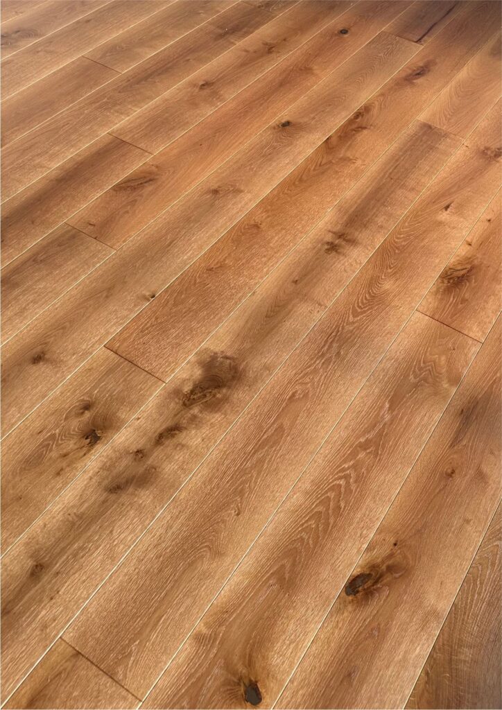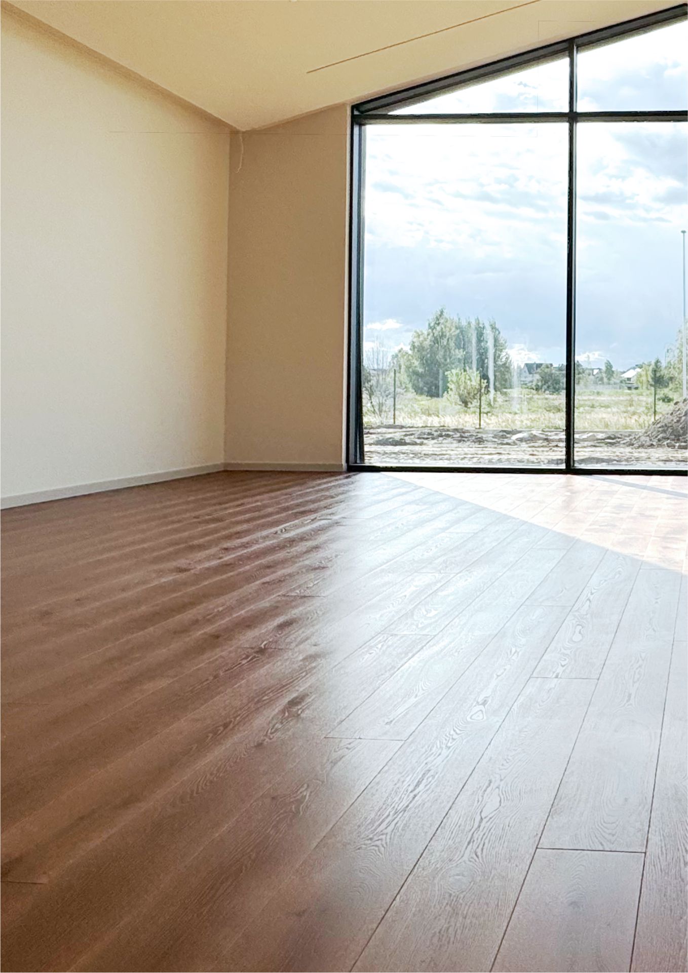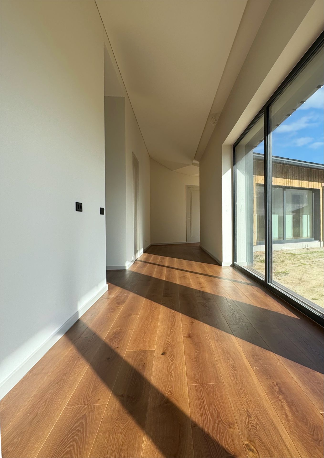 W tym projekcie ciepły odcień drewna łączy się z naturalnymi wzorami stworzonymi przez naturę. Wybrany kolor wykończenia Almond (C-5050) harmonijnie łączy się z sęcznym wzorem drewna, tworząc spójny rytm i grę światła. Ta dębowa podłoga jest nie tylko jednym z najważniejszych elementów domu i solidną podstawą, ale także wyraźnym akcentem wnętrza, nadającym przestrzeni niepowtarzalny charakter.