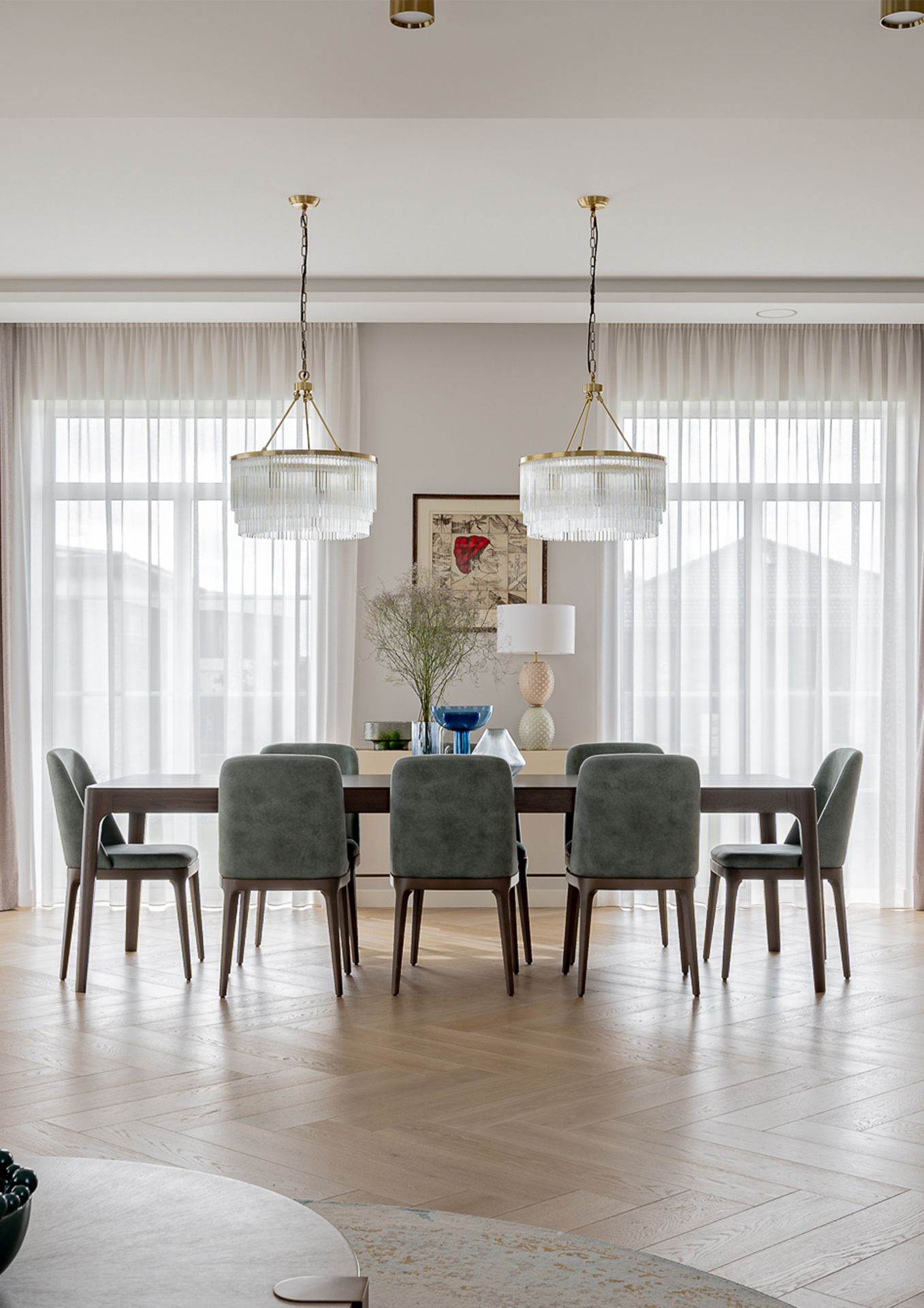 W tym wnętrzu pierwszoplanową rolę odgrywa światło oraz połączenie klasyki z nowoczesnością. Dębowa podłoga ułożona w klasyczną jodełkę 90° stanowi solidny fundament całej aranżacji – porządkuje przestrzeń, nadaje jej rytm i wprowadza wyrafinowaną elegancję. Wybarwienie Ivory (E-2410) subtelnie podkreśla naturalne usłojenie drewna, rozjaśnia wnętrze i pozwala światłu swobodnie wypełniać każdy jego zakątek.